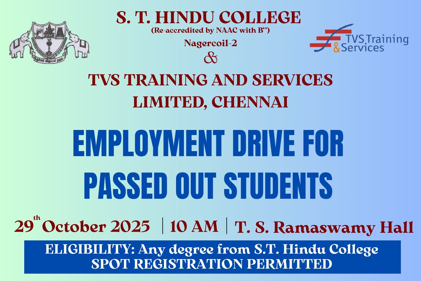 S.T. Hindu College & TVS Training and Services Ltd , chennai Conducting Employment Drive for Passed Out Students 2025 on 29th Oct 2025